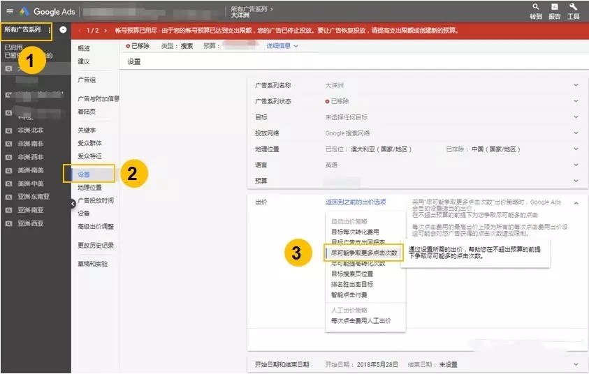 方法是:Google Ads账户>选择广告系列设置>出价策略>尽可能争取更多点击次数